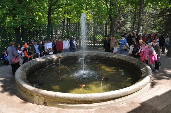 В бассейне фонтана «Фаворитный» или «Фаворитка» располагаются фигуры четырех уток и собачки, которые движутся по кругу. В движение